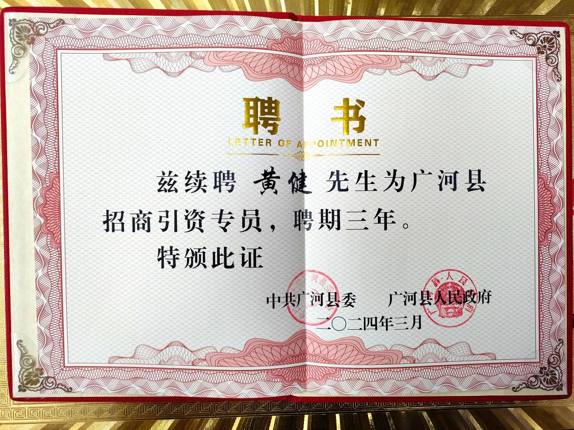 圖:燕之屋創(chuàng)始人、執(zhí)行董事兼董事長(zhǎng)黃健被續(xù)聘為廣河縣招商引資專員