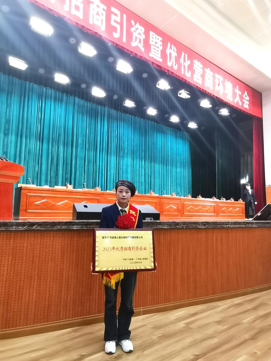 3月5日,甘肅省廣河縣招商引資暨優(yōu)化營(yíng)商環(huán)境大會(huì)成功召開(kāi)。會(huì)上頒發(fā)了招商引資專員聘書(shū),對(duì)優(yōu)秀招商專員、招商引資企業(yè)、先進(jìn)個(gè)人、先進(jìn)單位進(jìn)行了表彰,廣河縣燕之屋生物科技發(fā)展有限公司被評(píng)為“2023年優(yōu)秀招商引資企業(yè)”,燕之屋創(chuàng)始人、執(zhí)行董事兼董事長(zhǎng)黃健被續(xù)聘為廣河縣招商引資專員。