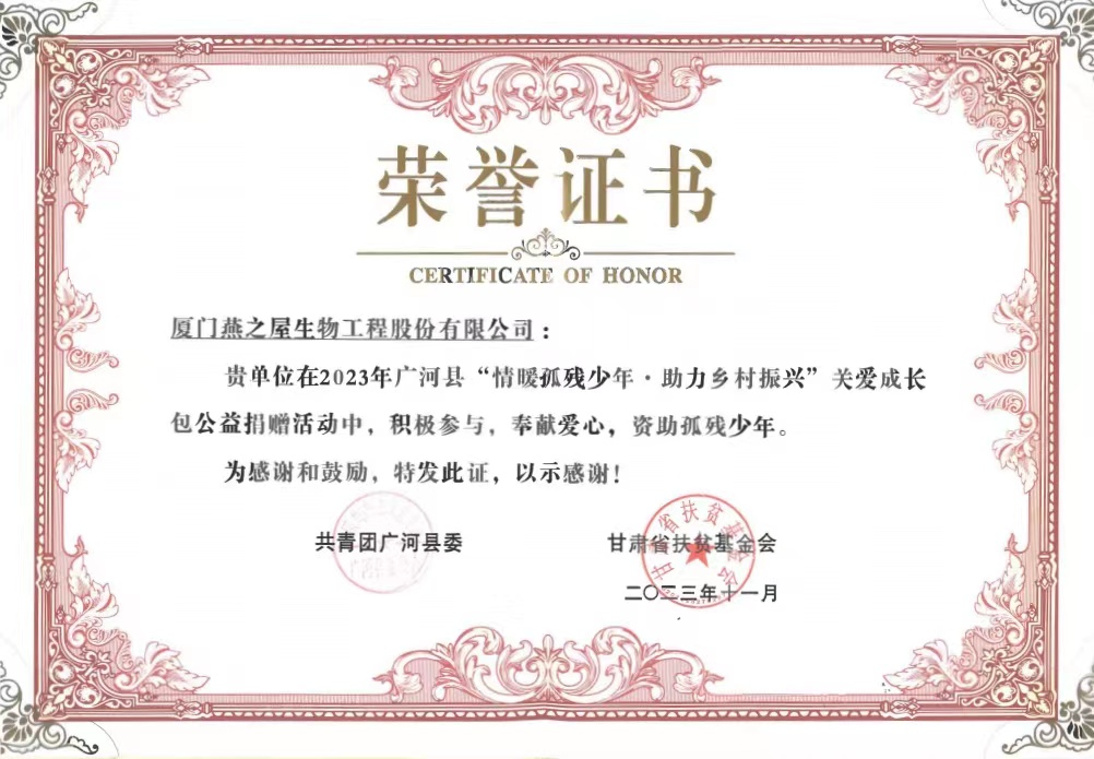 圖:燕之屋榮獲廣河縣“情暖孤殘少年·助力鄉(xiāng)村振興”關(guān)愛(ài)成長(zhǎng)包公益捐贈(zèng)活動(dòng)榮譽(yù)證書(shū)