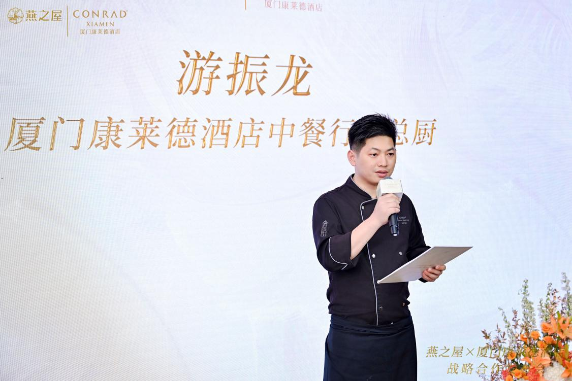 廈門康萊德酒店總經(jīng)理莫永泉也對此次合作滿懷期待,他在致辭中說道:“燕之屋作為一家26年的燕窩專營企業(yè),是中國上市的高品質(zhì)燕窩品牌,擁有廣泛的知名度與美譽度??等R德品牌成立于1982年,是百年酒店管理公司希爾頓集團旗下的奢華酒店品牌,倡導(dǎo)自信、創(chuàng)新與融合,我們的合作一拍即合。我們都知道好的菜品跟主廚的理解、烹飪方法和對食材品質(zhì)的挑剔,缺一不可。燕之屋的燕窩品質(zhì)是首屈一指的,非常榮幸可以有機會和燕之屋一起研發(fā)菜單。”