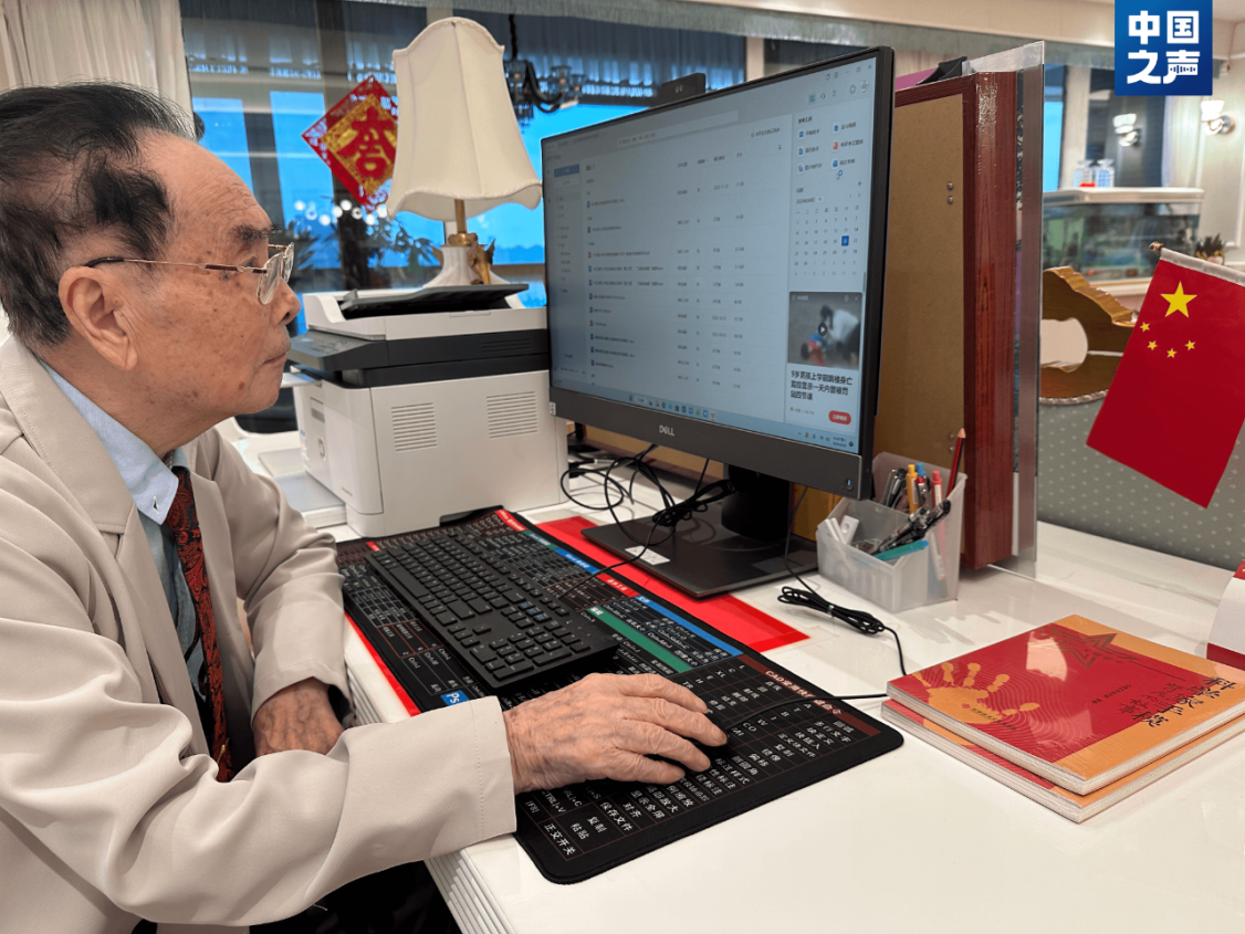 圖:95歲的侯云德每天在電腦前學(xué)習(xí)新知識(shí)和進(jìn)行學(xué)術(shù)創(chuàng)作