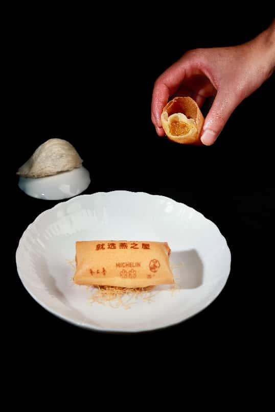 金湯燕窩春卷配香醋,改良傳統(tǒng)春卷技法,以燕之屋清潤(rùn)燕窩為餡,保證入口酥脆的同時(shí),更添輕盈、爽滑口感,搭配香醋的微酸回甘,呈現(xiàn)豐富味覺(jué)層次。以魯菜“炸”技見(jiàn)長(zhǎng)的外酥里嫩為靈感,王浩全將其改良為更輕盈的“空氣春卷”,酸、鮮、酥、潤(rùn)交織成舌尖上的藝術(shù),打破傳統(tǒng)春卷的形態(tài)束縛。
